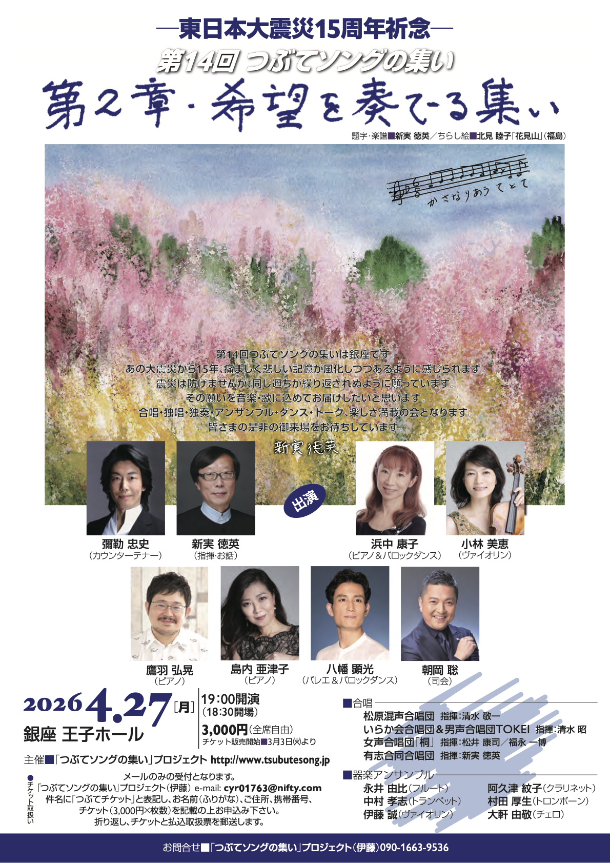 第2章となる集いは、心のこもった合唱、素晴らしいソリスト達による歌、器楽演奏、さらにダンスも加わって未来に向かって前進する「希望を奏でる集い」です。多くの皆さんのご来場をお待ちしております。