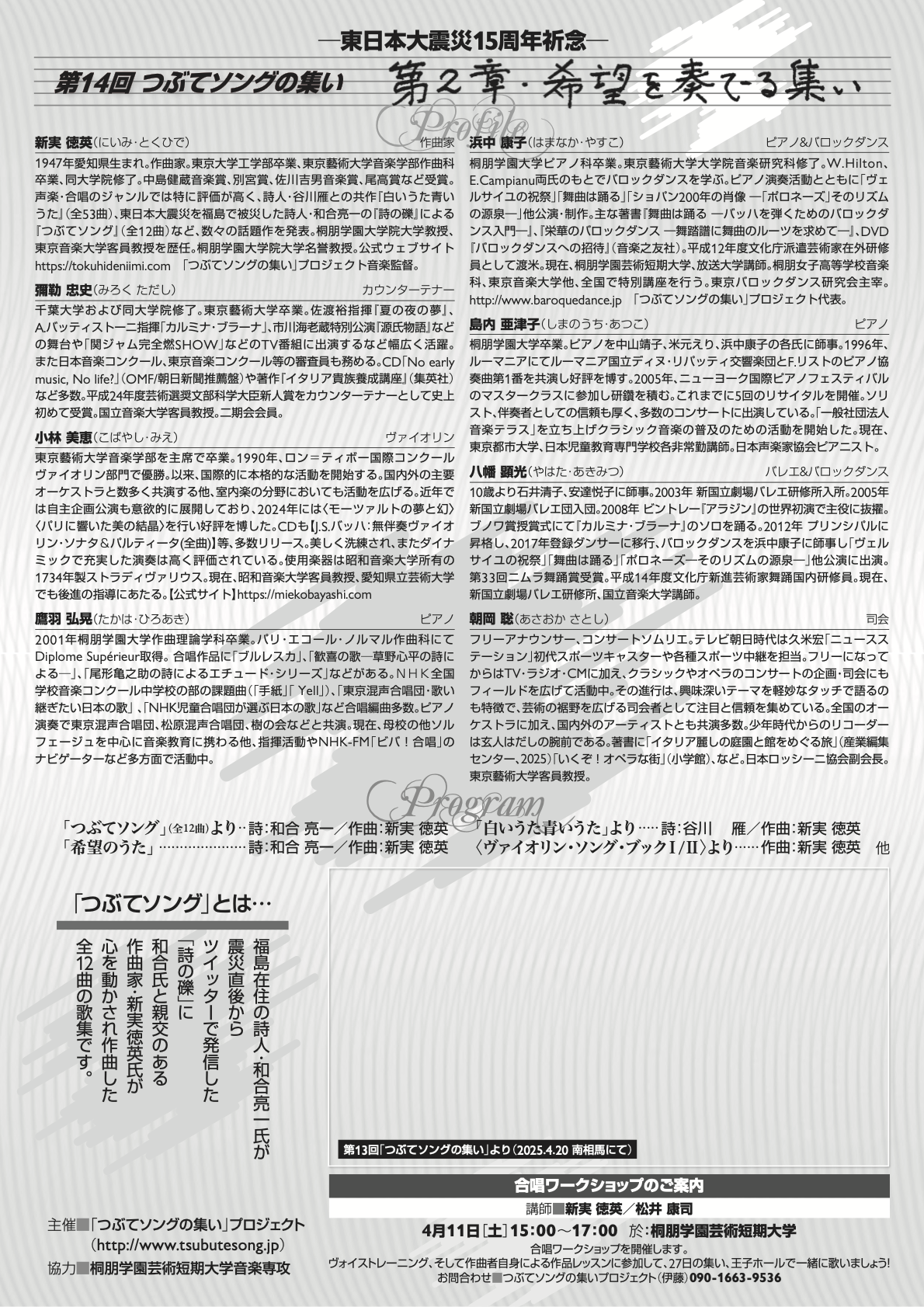 音楽を通しての復興支援として続けてきた「つぶてソングの集い」は、東日本大震災から 15 周年を祈念して、今年は東京:銀座 王子ホールにて開催します。今回も有志合同合唱に向けて下記の通り、ワークショップを行います。